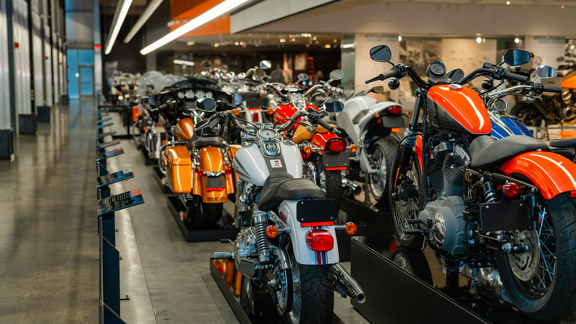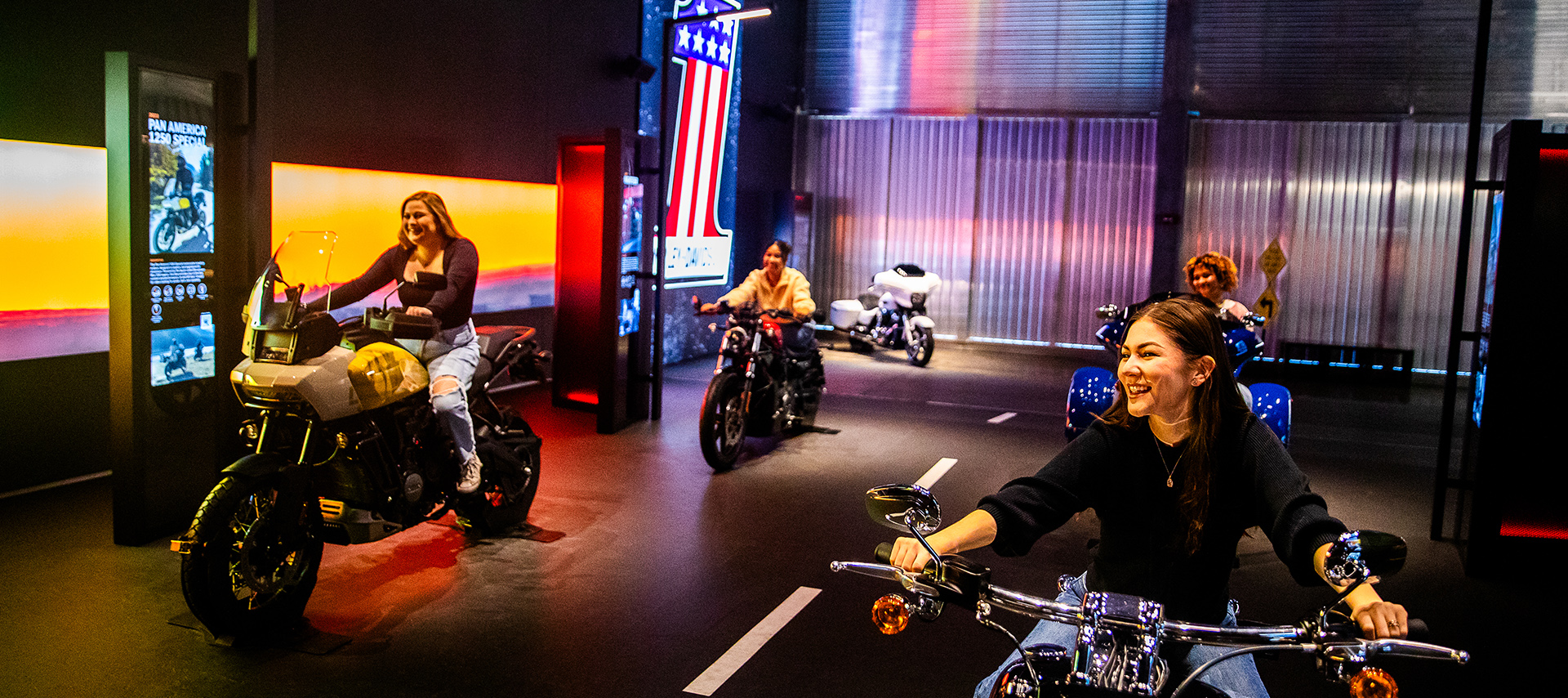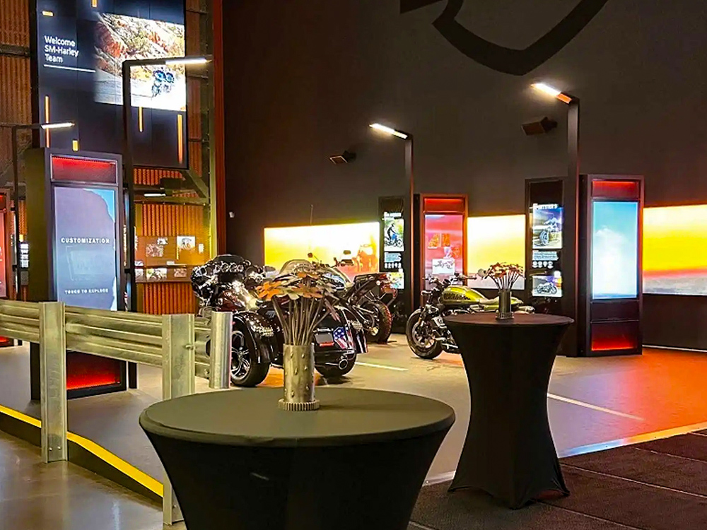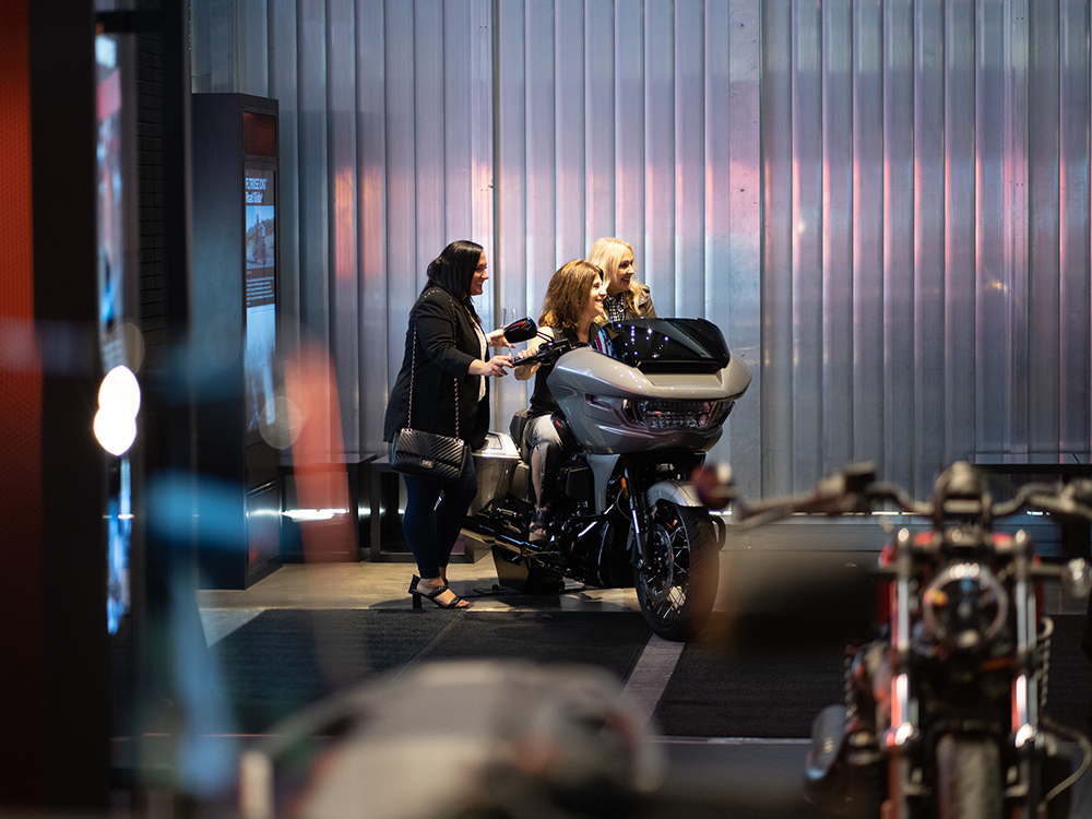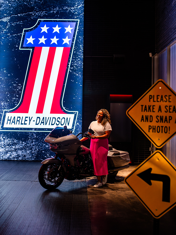 The Experience Gallery showcases the newest Harley-Davidson motorcycles for guests to sit on and snap selfies. Bold H-D branded graphics and dynamic video displays create an immersive atmosphere.