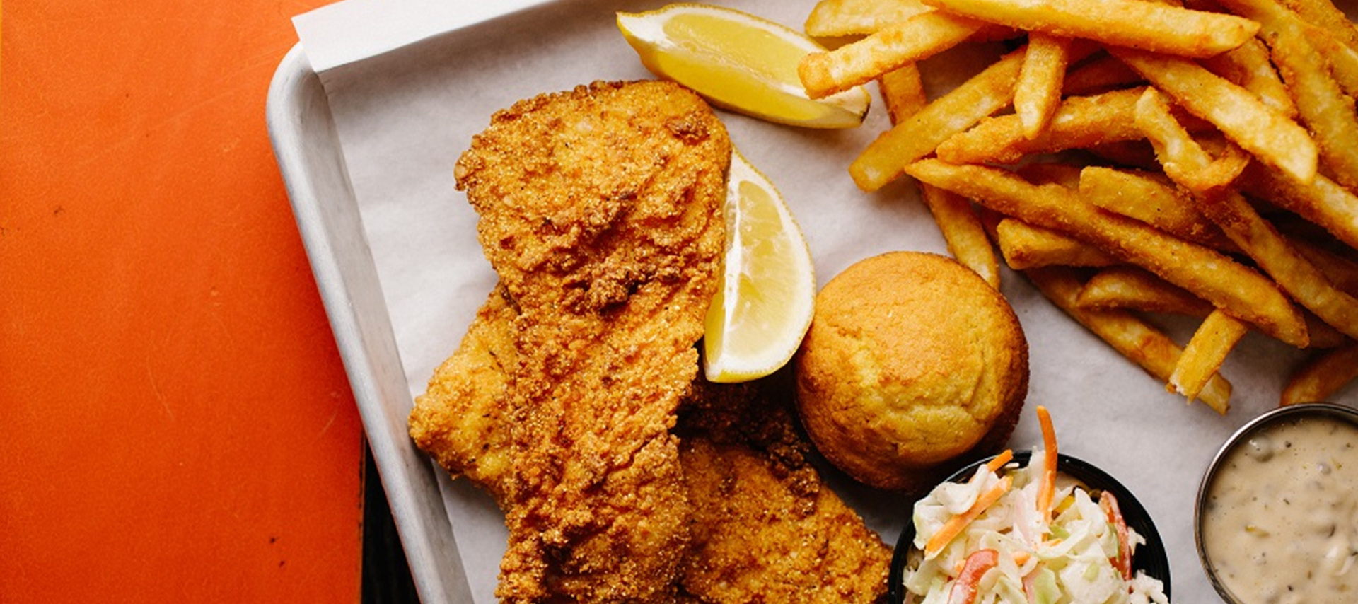 3 pieces of beer-battered & golden-fried cod, served with French fries, house jicama slaw, cornbread muffin, and tartar sauce